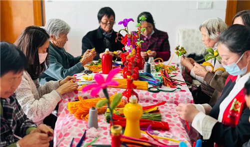 张家港市德积街道朝南村的老人们在志愿者的带领下一起制作扭扭棒花束,闲置的酒瓶、颜色鲜艳的扭扭棒,在老人们的手中变成五彩缤纷的花束,老人们一边聊天一边做手工,不仅愉悦了心情,更装点了美好生活。
