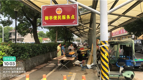 图为相城区御亭集贸市场设置便民服务点,提供裁剪缝补服务